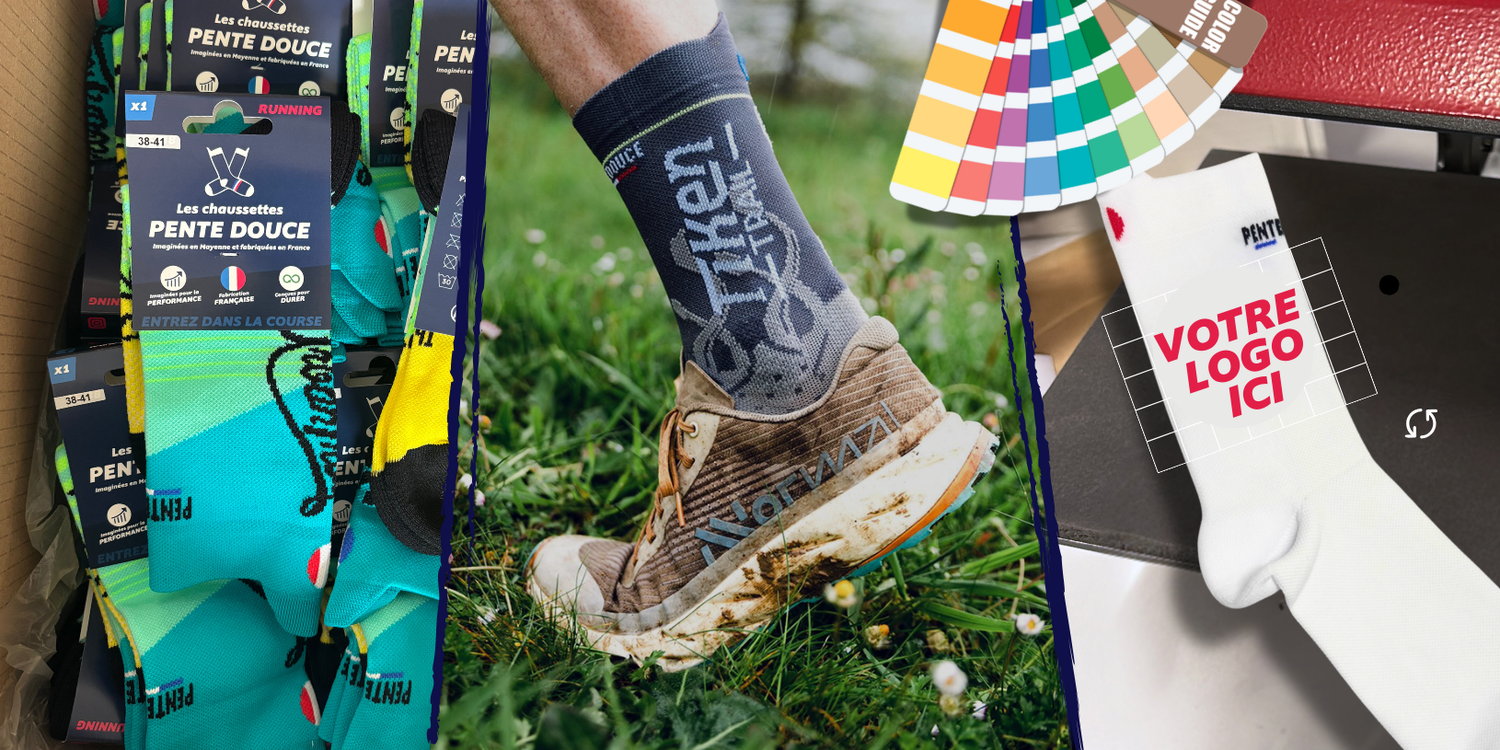Que ce soit pour un événement sportif, ton club, ton association ou ton entreprise, Pente Douce t'accompagne dans la création de chaussettes personnalisées.